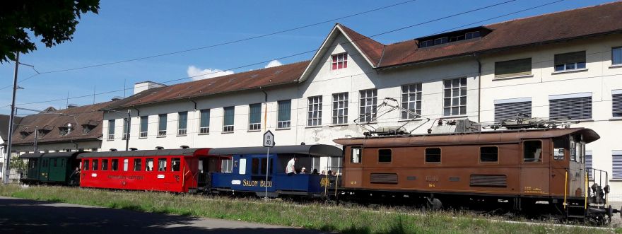 Bild: Ersatzkomposition Be 4/4 Nr. 14 der Eurovapor, zusammen mit den Nostalgiewagen des Mostindien-Express des Vereins Historische Mittel-Thurgau-Bahn. Hier bei einer Charterfahrt am 16.06.2018 bei Märwil.