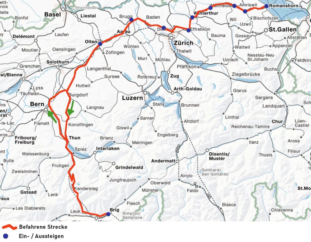 Zustieg in: Romanshorn • Sulgen • Weinfelden • Frauenfeld • Winterthur • Effretikon • Regensdorf-Watt • Baden • Brugg AG • Olten